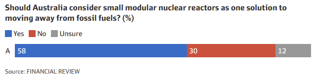 What I would like to see from our politicians and business leaders is a sober look at the trade-offs. The ban on nuclear is difficult to justify on safety alone, and the public has started to warm to the idea of having a facility in their backyard, weakening the political case for prohibition: a recent Newspoll showed 55% were now in favour of nuclear power, with that figure rising to 65% among 18 to 34-year-olds.