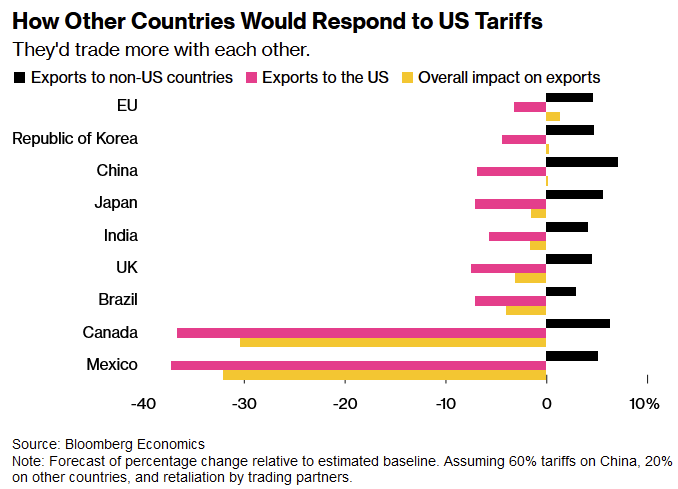 - Indiana University’s Ahmad Lashkaripour wrote a good X thread on what economists think about tariffs. One in particular stood out: if Trump kicks off a full-scale tariff/trade war, it could cost the “equivalent to erasing South Korea from the world economy”.