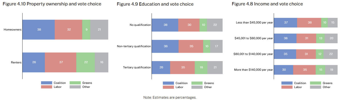 University-educated Millennials (born between 1981 and 1996) and the Gen Z (1996+) of voting age form the bulk of the Greens’ base. Given their age, they are more likely to rent than any other demographic, but also have relatively high incomes consistent with their educational status.