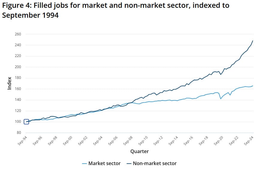 “In the last two calendar years, 87 per cent of all employment growth in the economy has been in the ’non-market’ sector – public administration and safety, education and training, and healthcare and social assistance – despite it accounting for just 30 per cent of jobs. In the September quarter, it accounted for 91 per cent of all employment growth.”