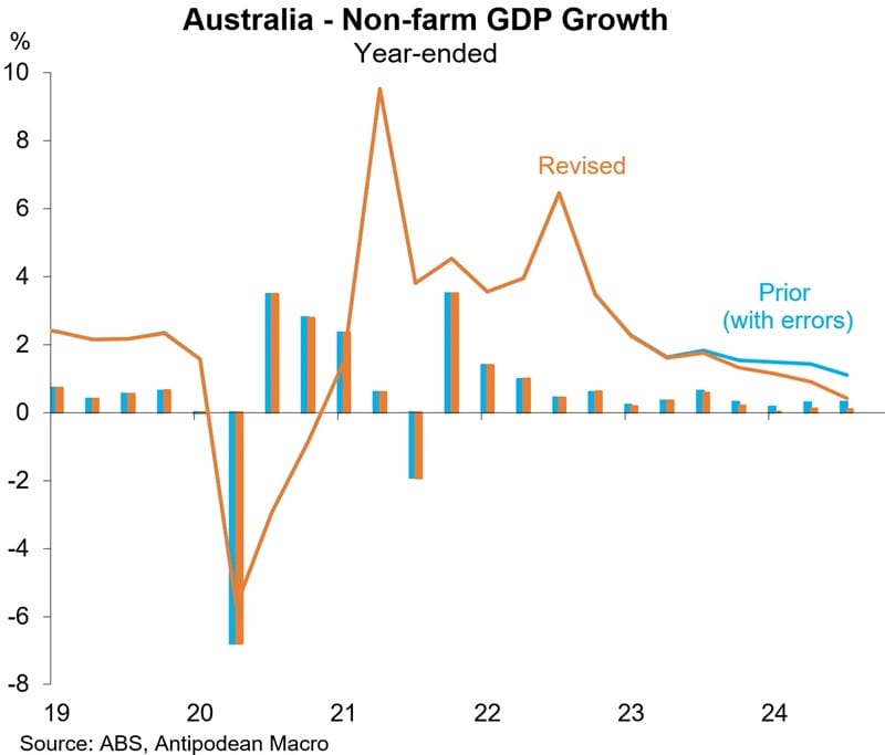Indeed, given the recent upward revision to farm output, Australia may already be in a technical recession this quarter despite strong population growth and record government spending: