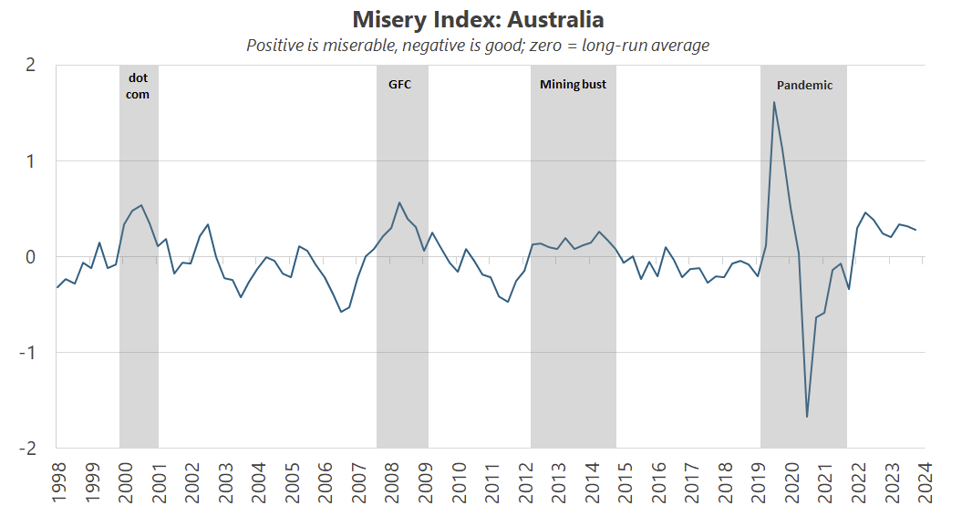 At no point this century has Australia’s Misery Index been this high above the long-run average for this long. It was higher at the start of the pandemic, during the peak of the global financial crisis, and very briefly during the dot-com bust. But in all of those episodes, it promptly reversed.