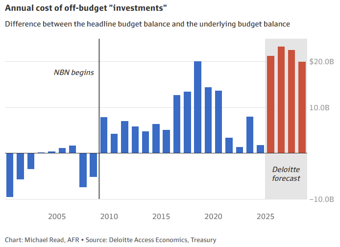 A lot of spending is also being hidden from voters, with everything from HECS debt forgiveness to a Future Made in Australia being classified as “investment” to keep it out of the Budget’s underlying deficit figure.
