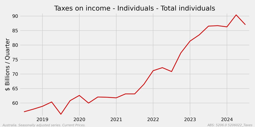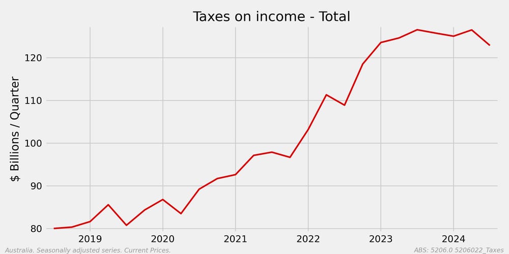 Meanwhile, the tax take on incomes – i.e. productive labour – is close to record highs, despite the Stage 3 cuts: