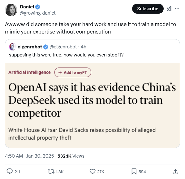 There are also accusations flying from OpenAI that DeepSeek researchers were “exfiltrating a large amount of data using the OpenAI application programming interface [API]”, which should be very familiar given that’s basically what they did to get started (a group of news organisations including the NYT are currently suing OpenAI for data exfiltration):