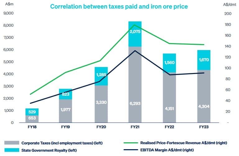 When the terms of trade rises, which means the price we get for our exports increases faster than what we pay for imports, many governments – but especially the Commonwealth – enjoy ‘free’ revenue, due to our world-leading 30% corporate tax rate. Mining companies can deduct expenses from their corporate tax obligations, but when prices reach a certain level those deductions are exhausted and it becomes close to a pure 30% tax on mining revenue, as shown in Fortescue’s Sustainability Report.
