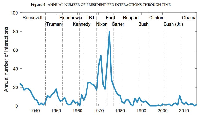 “I find that political pressure shocks increase inflation strongly and persistently. My procedure can quantify this effect: increasing political pressure 50% as much as Nixon for six months increases the U.S. price level by 8%. While the benefits of central bank independence have largely been highlighted using cross-country data, my results demonstrate them using evidence from within one economy through time.”