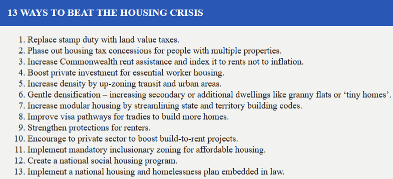 - One of the worst on the list is the idea for a national social housing program (12). While no doubt music to the Greens’ ears, it’s likely to involve considerable expenditure, does nothing to address the actual causes of the housing crisis, and has large welfare implications as the benefits would be concentrated among specific groups.