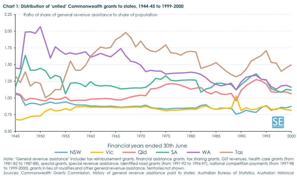Finally, Eslake and Richardson also don’t appear to understand the full history of horizontal fiscal equalisation. For example, Eslake likes to trot out this chart in defence of his position that “for more than seventy years Western Australia received a larger share of ‘untied’ Commonwealth grants than it would have done had they been distributed on the basis of population shares, a more favourable outcome (from Western Australia’s standpoint) than for any other state except Tasmania”: