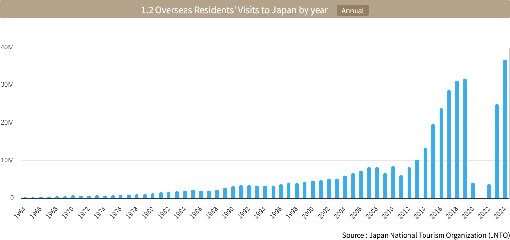 Tourism now makes up 7.5% of Japan’s GDP, versus around 3% in Australia. And unlike Australia where that economic share has been more or less flat for twenty years, the tourism share in Japan has increased by nearly 300% over the same period. Just take a look at visitor numbers: