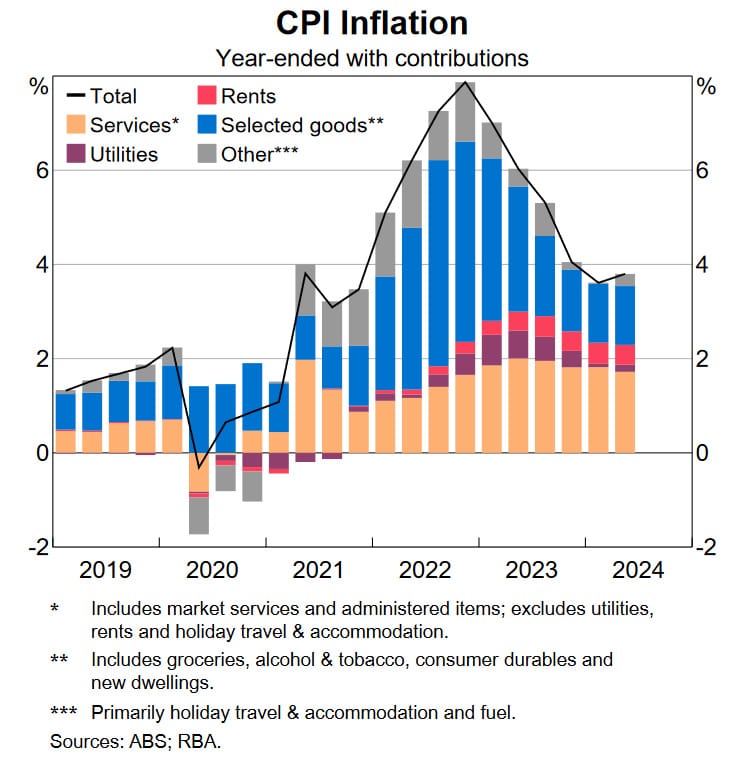 The RBA is right that demand has been strong and inflation’s sticky in Australia, especially in domestically-driven components such as services and non-tradables (orange bars below):