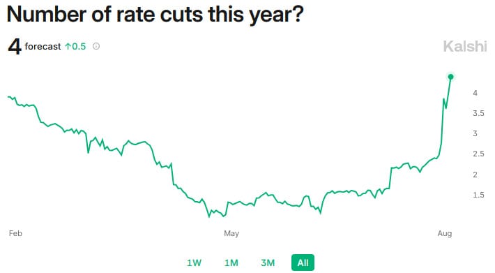 That fact was perhaps ‘realised’ after the jobs release, as US futures markets moved from pricing in a 90% chance of a 25 basis point cut in September to an 80% chance of a 50 basis point cut. Betting markets also reacted strongly: