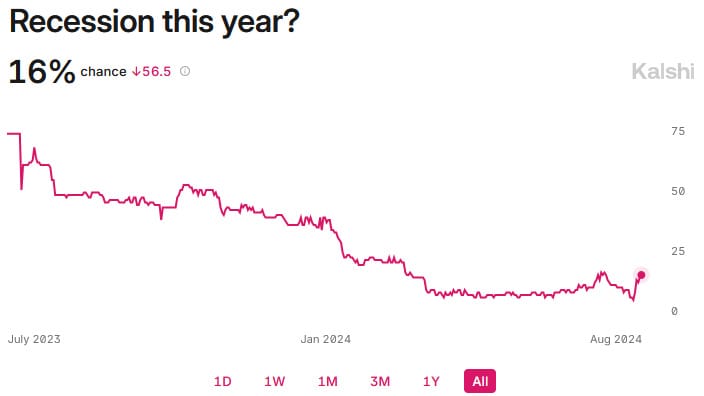 Will there be broader impacts? Probably not: people with skin in the game – punters – barely raised their recession odds for 2024 (with the caveat that there’s not yet a 2025 contract, which would probably tell us a lot more given the lags involved).
