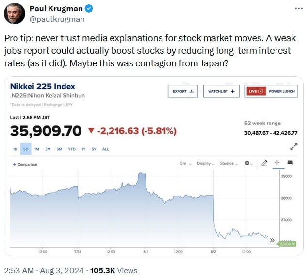 No one really knows what will happen as these speculative bets are unwound. The VIX, or Volatility Index, hit its highest level since the pandemic, and there’s inevitably going to be plenty of market gyrations as the uncertainty plays out – Japan’s Nikkei index promptly recovered around 10% yesterday.