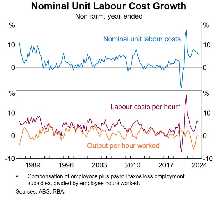 If we don’t get the productivity the RBA is forecasting, then we’re basically facing a real shock, in part because of lagged inflation: nearly 60% of wages are set by award or collective agreement in Australia, by bodies that tend to look at the year just gone when setting them. That means labour costs will continue rising into a stagnant economy, and without productivity improvements, businesses may have to start shedding workers.