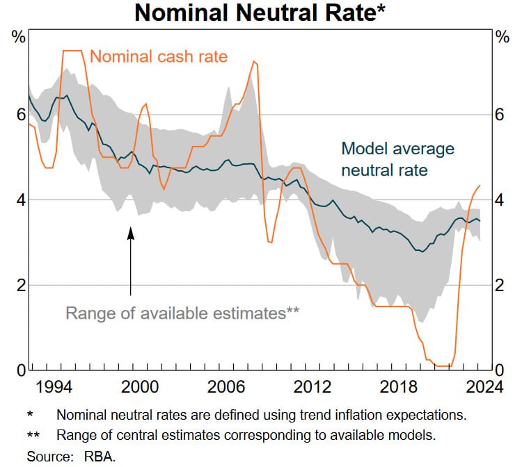 We can’t know what that rate is but there are a few approximations. The RBA produces an estimate – it calls it the ’neutral’ rate – and occasionally releases it publicly, as it did in this month’s statement: