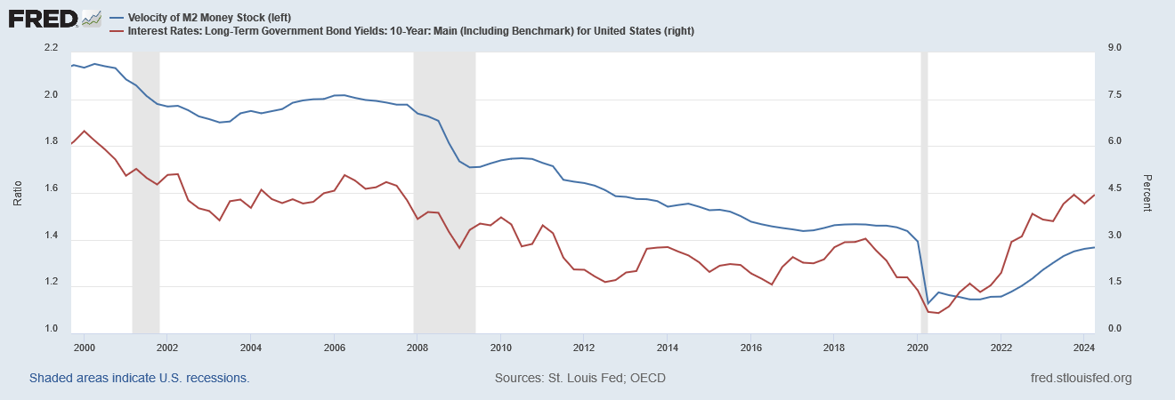 If so, that means monetary policy is probably quite a bit tighter now than it was even a week ago, because lower long-term rates in that scenario tend to mean lower money velocity (how frequently a dollar changes hand), which will also reduce aggregate demand (nominal GDP) without an offsetting increase in the money supply (e.g. through deliberate monetary easing).