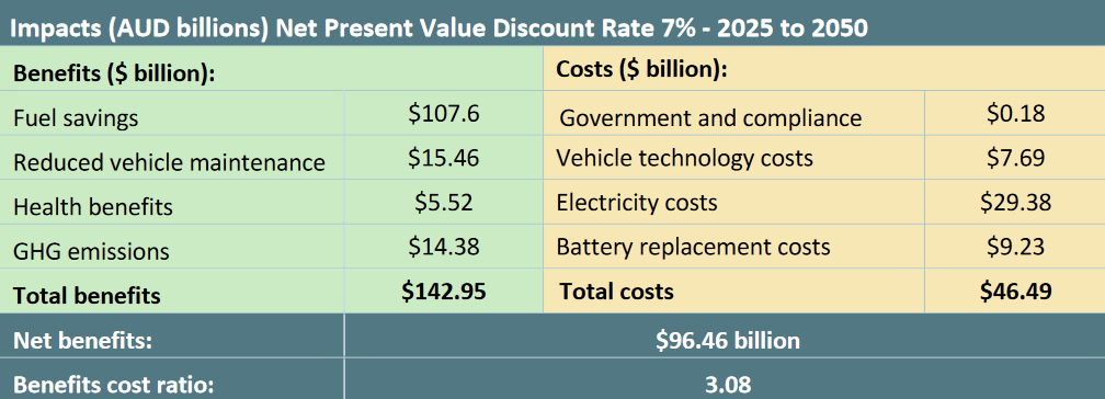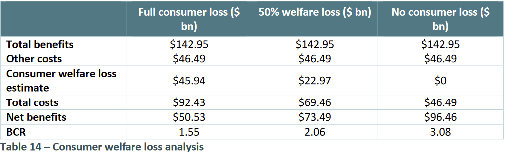 But back to the numbers. If we take the provided “full consumer loss” as a given (without the Department’s full workings I can’t be sure what they did) and subtract it from the above, the BCR drops to 0.55, i.e., to nearly half the estimated costs. Even subtracting just the 50% welfare loss scenario, which would be a huge assumption to make given how perturbed people are by this change and how popular ICE vehicles are in Australia today, the BCR drops to 1.05: barely above 1.0.