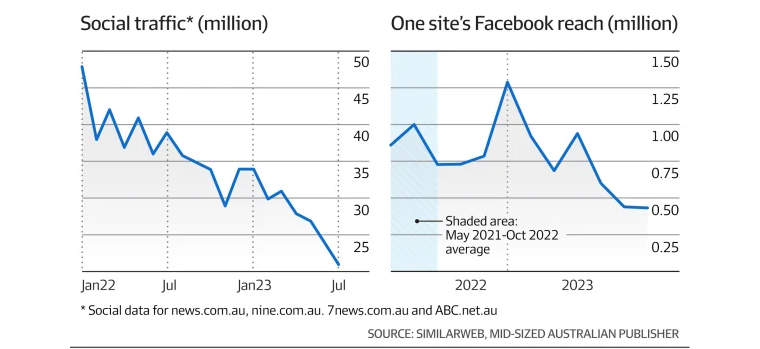 “Combined referrals from social media platforms for four of Australia’s most popular news websites – news.com.au, nine.com.au, 7news.com.au and abc.net.au – show a fall from nearly 50 million to just over 20 million a month, according to SimilarWeb. Facebook referrals comprise the vast majority of that social traffic.