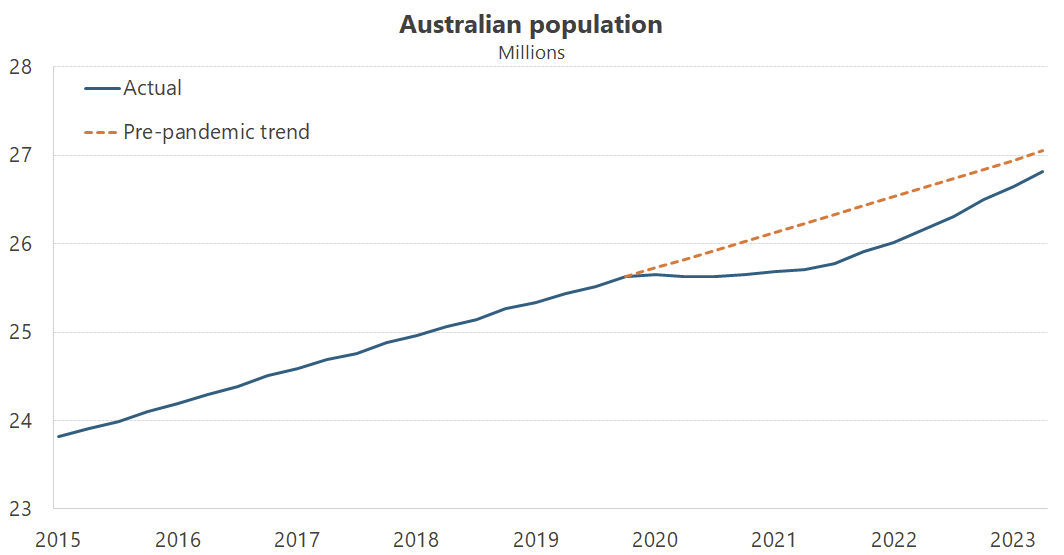 We may not ever reach the pre-pandemic trend, either, because the recent surge in net migration is temporary; students and backpackers couldn’t get into the country for a couple of years. During those years, existing visa holders left but no one came in to replace them. Now the reverse is happening, with new temporary visa holders coming in each year but no departures to offset their arrival. The vast majority of students finish their degrees and then go home, and many will soon start doing that again.