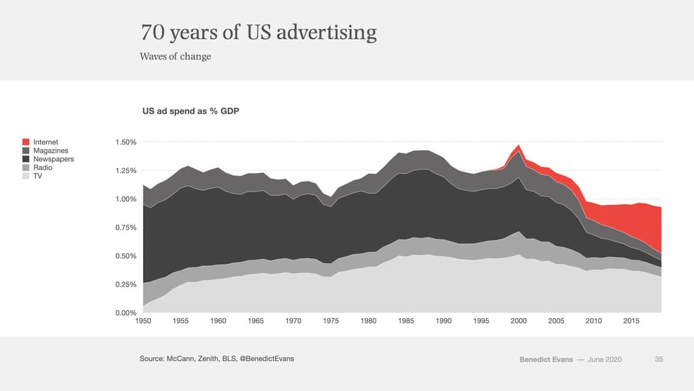 “[I]f you talk to people at both Google and Facebook and in the agency world, you’ll hear that a lot of the money spent on Google and Facebook is money that was never spent on traditional advertising - it’s coming from SMEs and local businesses that might have spent in classified at most but probably wouldn’t have done even that. $60bn of consumer spending went through Shopify last year - it’s safe to assume those vendors spent money on advertising, but how many of them would have bought an ad in a local newspaper? This has also come at much lower prices: Facebook in particular has been massively deflationary to online advertising: it offers vast quantities of relevant advertising inventory at much lower prices and much lower entry costs than you’d have needed in print, let alone TV.”