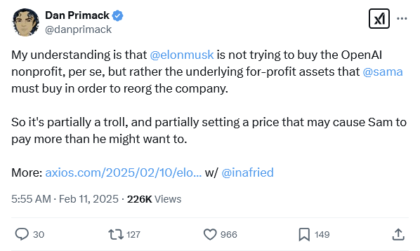 “By making the offer, Musk makes it obvious that OpenAI was dramatically undervaluing these assets — and draws attention to the fact that Altman, in his capacity as a board member of the non-profit, is helping to negotiate the sale of all the non-profit’s assets to Altman, in his capacity as the CEO of the for-profit, all at what now appears to be a fire-sale price.”