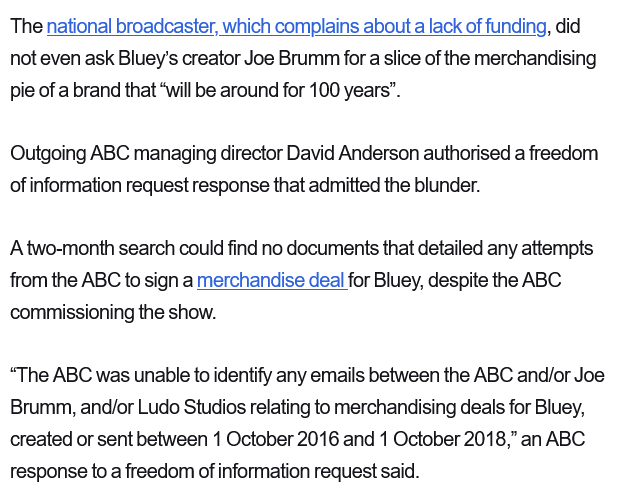 The ABC blew a deal potentially worth billions of dollars by not seeking a slice of Bluey merchandise: