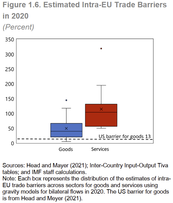- To counter Trump, Europe first needs to take a long, hard look in the mirror: “The IMF estimates that Europe’s internal barriers are equivalent to a tariff of 45 per cent for manufacturing and 110 per cent for services. These effectively shrink the market in which European companies operate: trade across EU countries is less than half the level of trade across US states. And as activity shifts more towards services, their overall drag on growth becomes worse.”