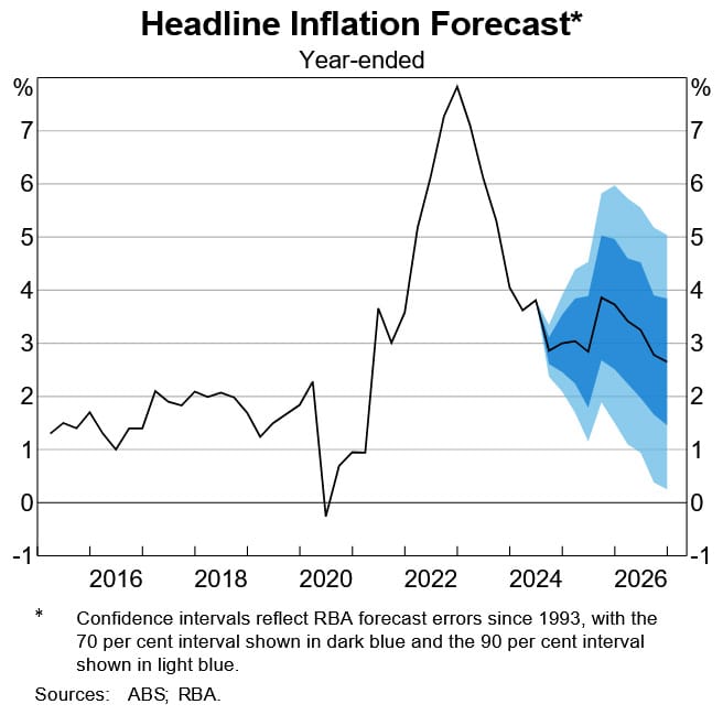 Unlike elected governments, the RBA doesn’t need to cost election commitments over the forward estimates. And central banks struggle to foresee three months into the future, let alone nearly three years. It’s why charts like this from its recent outlook have such huge errors bands in both directions: