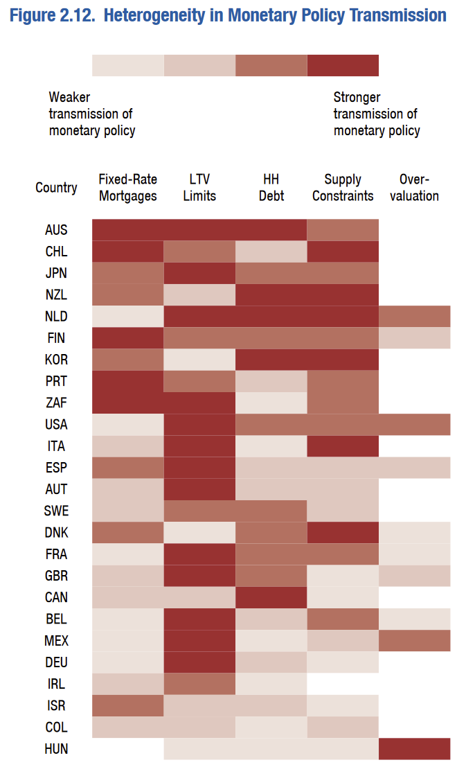 “Monetary policy has greater effects where (1) fixed-rate mortgages are not common, (2) home buyers are more leveraged, (3) household debt is high, (4) housing supply is restricted, and (5) house prices are overvalued.”