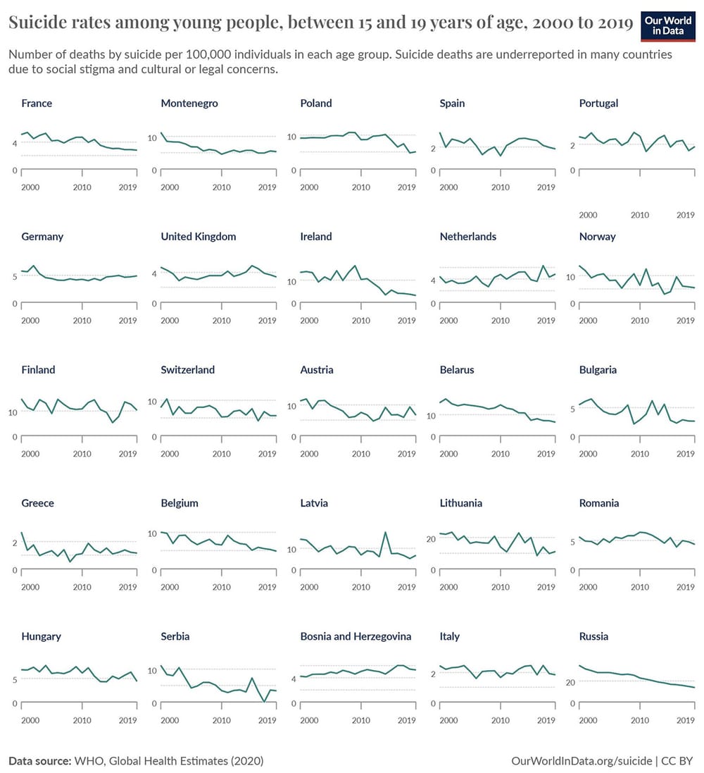 Looking at the data, most European countries have seen steady or declining rates of suicide among young people over the past couple of decades: