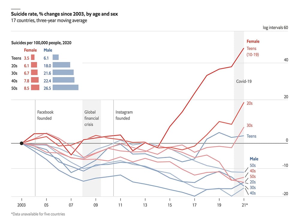 A rise in social and health issues among young people is certainly worth investigating. In this case, the culprit for the “surge” – at least in the US – appears more likely to be the result of new bureaucratic guidelines that required hospitals to record self-harm more accurately. According to Wallace-Wells, those “changes explain nearly all of the states apparent upward trend in suicide-related hospital visits, turning what were ’essentially flat’ trendlines into something that looked like a youth mental health ‘crisis’.”