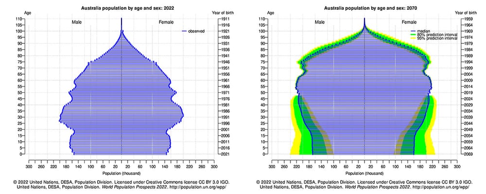 Most of Australia’s entitlements – e.g. the Aged Pension, Medicare, Carer, Disability – are funded with general revenue. That’s all well and good when the demographic pyramid looks like the left panel below, with most of the population of working (tax-paying) age. But it gets a lot less OK when it begins to look more like the median projections on the right panel.