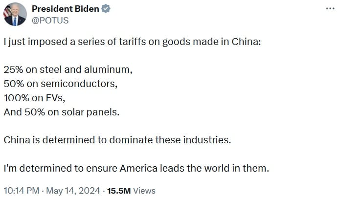 Last week it was Europe, now coming to you from the land of the free is a series of protectionist measures, including 100% tariff on Chinese electric vehicles, courtesy of the tariff man, President Trump Biden: