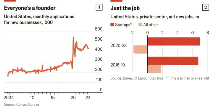 “Last year applications to form businesses reached 5.5m, a record. Although they have slowed a touch this year, the monthly average is still about 80% higher than during the decade prior to covid, compared with just a 20% rise in Europe. Startups normally play an outsized role in creating employment in America, as elsewhere. By definition, every startup job counts as new, whereas mature companies have more churn. That difference has become even starker. In the four years before the pandemic, established firms added one net job for every four created by startups; in the four years since the pandemic, established firms have actually lost one job for every four created by startups.”