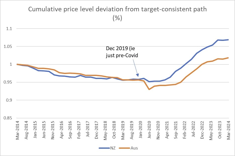 It turns out that both central banks – that is, the RBA and the Reserve Bank of New Zealand (RBNZ) – undershot their respective inflation targets in the ~six years leading up to the pandemic. As we all know, they then overshot them in a big way following the pandemic, to the point that all those years of mistakes have now been wiped out – and some: