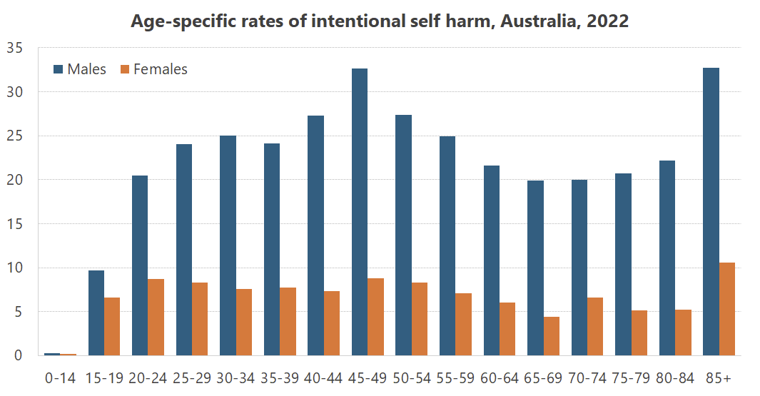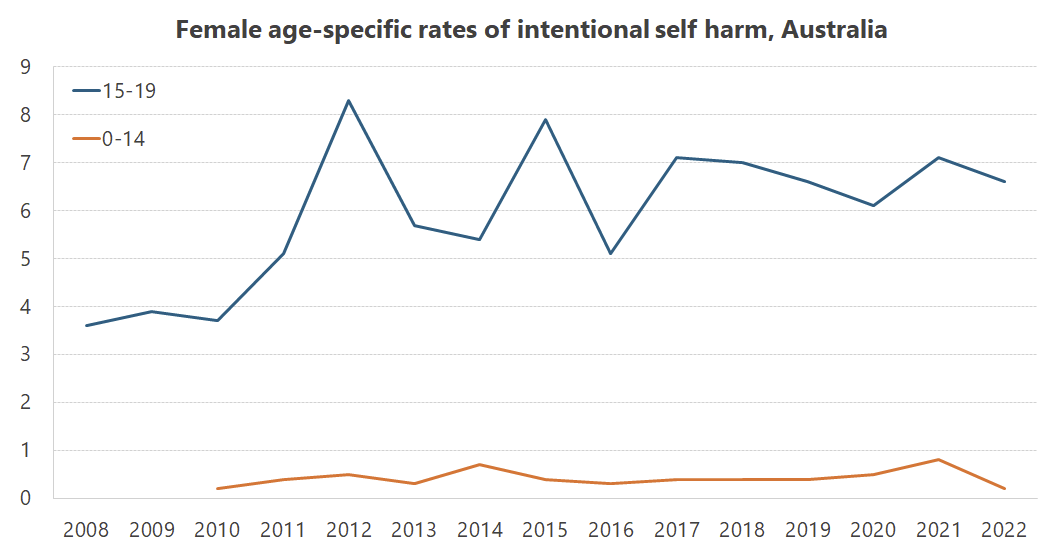Moreover, the rate is still incredibly low; Australian girls aged 15-19 are far less likely to commit self harm than males of any age over 14.