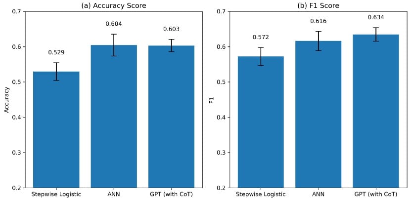 “This figure compares the prediction performance of GPT and quantitative models based on machine learning. Stepwise Logistic follows Ou and Penman (1989)’s structure with their 59 financial predictors. ANN is a three-layer artificial neural network model using the same set of variables as in Ou and Penman (1989). GPT (with CoT) provides the model with financial statement information and detailed chain-of-thought prompts. We report average accuracy (the percentage of correct predictions out of total predictions) for each method (left) and F1 score (right). We obtain bootstrapped standard errors by randomly sampling 1,000 observations 1,000 times and include 95% confidence intervals.”