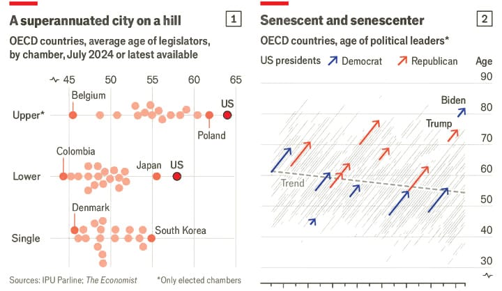 But the US has dozens of them in Congress, with their legislators uniquely old by global standards and getting older, despite the OECD trend towards youth.