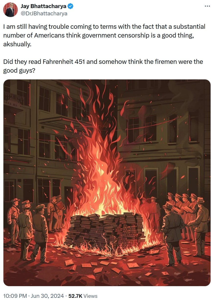 We don’t have free speech in this country but that doesn’t mean it’s not still dangerous when both sides of politics are actively trying to suppress it even further. As Sanford’s Jay Bhattacharya warned, it’s as though “they read Fahrenheit 451 and somehow think the firemen were the good guys?”