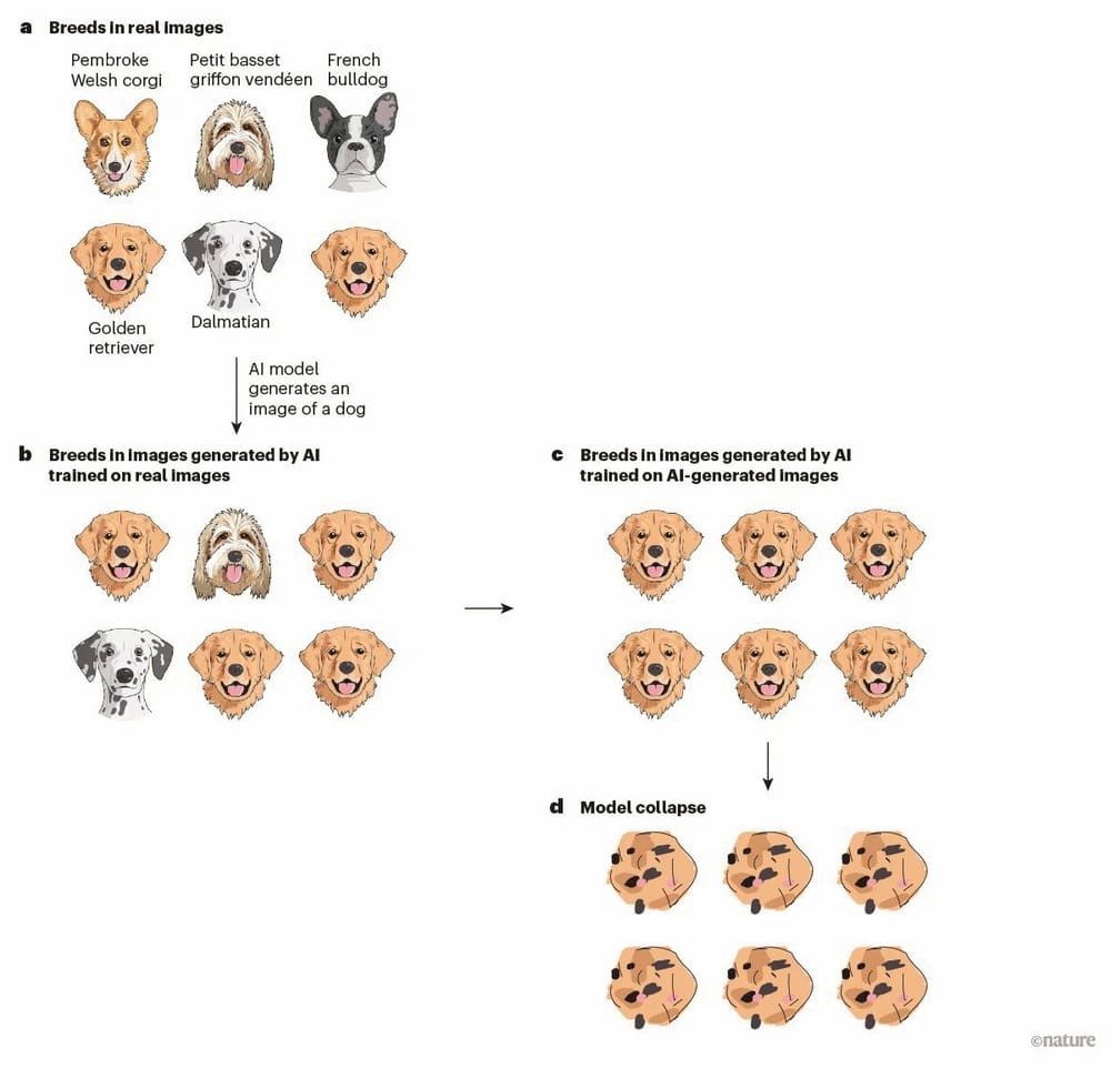 A newly published paper in Nature found that it’s not possible to train AI on AI-generated data and expect them to continue improving. After a while, the model collapses and ends up producing crap: