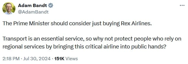 Rex Airlines, Australia’s third carrier and only provider of many regional services, entered voluntary administration this week. Like clockwork, there were calls for the government (i.e., taxpayer) to bail it out:
