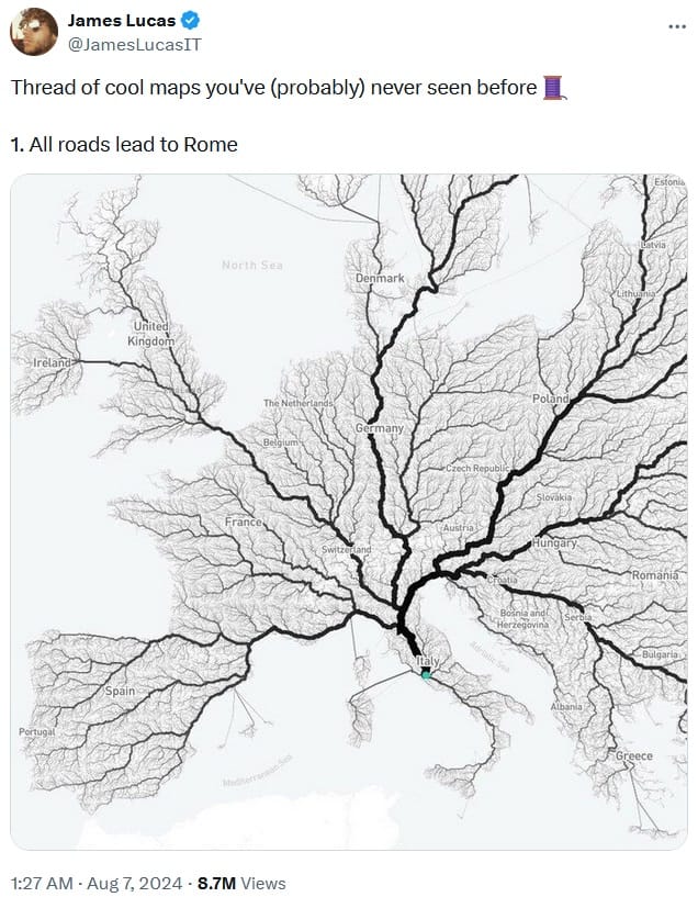 The Roman Empire built something like 400,000km of roads, 120,000km of which were paved. That’s enough paved road to lap Australia around eight times.