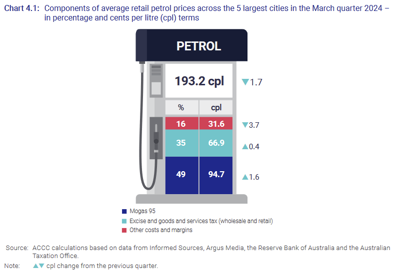 The reason prices are higher in Brisbane is because there’s less competition: there aren’t as many stations per capita and there are fewer independent stations than in other cities. As a result, service station margins are higher in Brisbane than in other cities, although context is important – margins are still the smallest component of retail fuel costs: