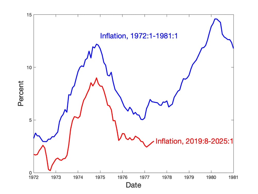 He also offered this chart – plotted “for fun, not as a forecast”, given correlations alone tell us little about causation or future paths – showing an uncomfortable similarity between today and the last major inflationary shock.
