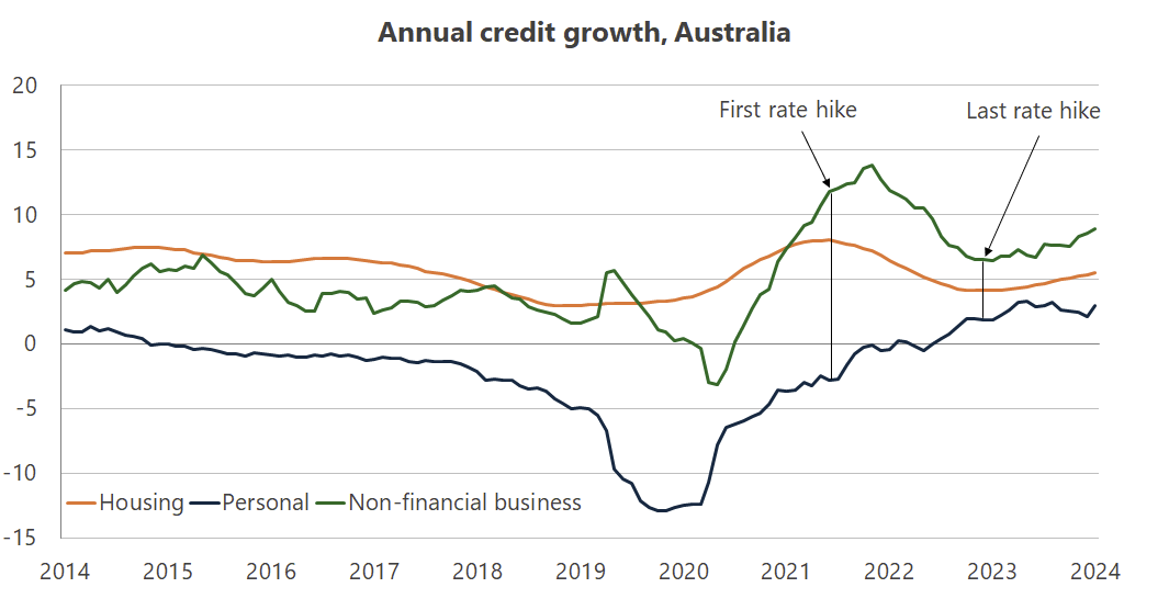 For example, credit growth to all borrowers has been steadily increasing since the end of 2023, which was around when the RBA did its last rate hike (8 November 2023).