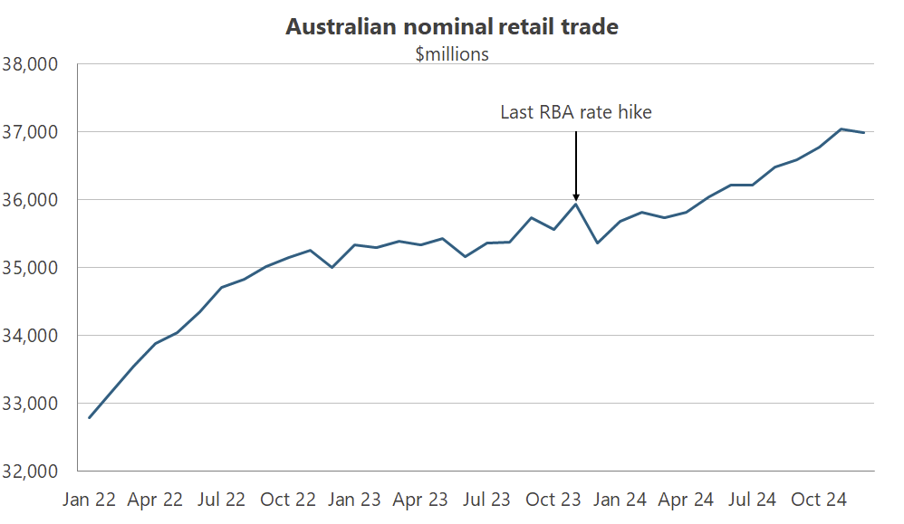 A similar pattern can be observed in retail sales, which after plateauing for several months during the RBA’s tightening cycle, have proven to be robust.