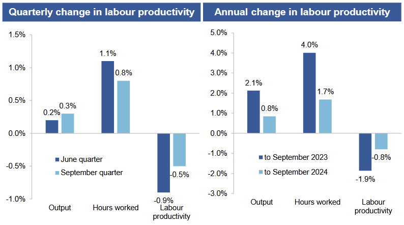 If you have no productivity growth, then to achieve the RBA’s mandate of 2-3% inflation, nominal wages – currently growing at 3.5% annually – must be kept within the same range (i.e. zero real wage growth). Any growth in nominal wages above and beyond that rate will only translate into higher prices.