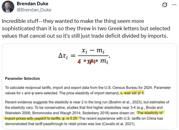 In the hours after Trump’s announcement, people quickly reverse engineered the formula used in calculating the “reciprocal” tariff rates. It’s literally just (imports-exports)/imports, halved. If the result is below 10%, that’s what they get.