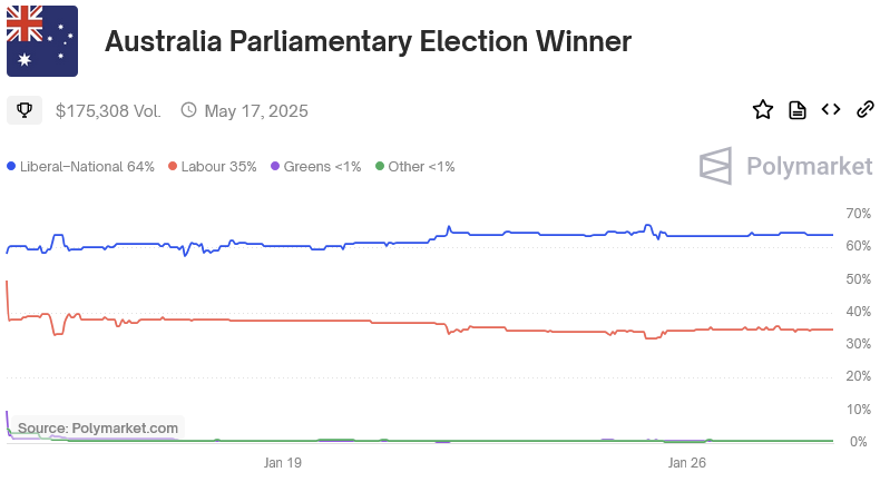 Then there’s the final variable: political pressure. There’s a federal election due sometime between now and May, and the Albanese government is trailing in the polls and on prediction markets: